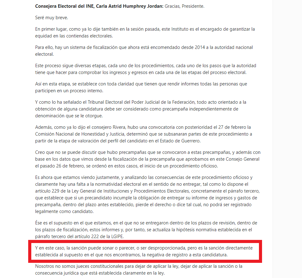 En contraste, la consejera Carla Humphrey consideró que la sanción puede "ser desproporcionada" pero es la que se establece en la ley.