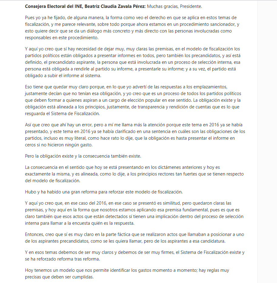 Por su parte, la consejera Beatriz Claudia Zavala consideró que el caso actual, es diferente que en 2016, pues los candidatos de Morena hoy desconocieron ser precandidatos (aunque presentaron sus informes de forma extemporánea). Y por lo tanto, se debe aplicar la ley.