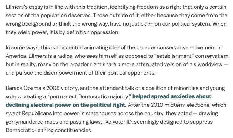 The point there is kindred in spirit to a comment by @zackbeauchamp on a recent far-right screed that, in his words, “[identifies] freedom as a right that only a certain section of the population deserves." vox.com/policy-and-pol…