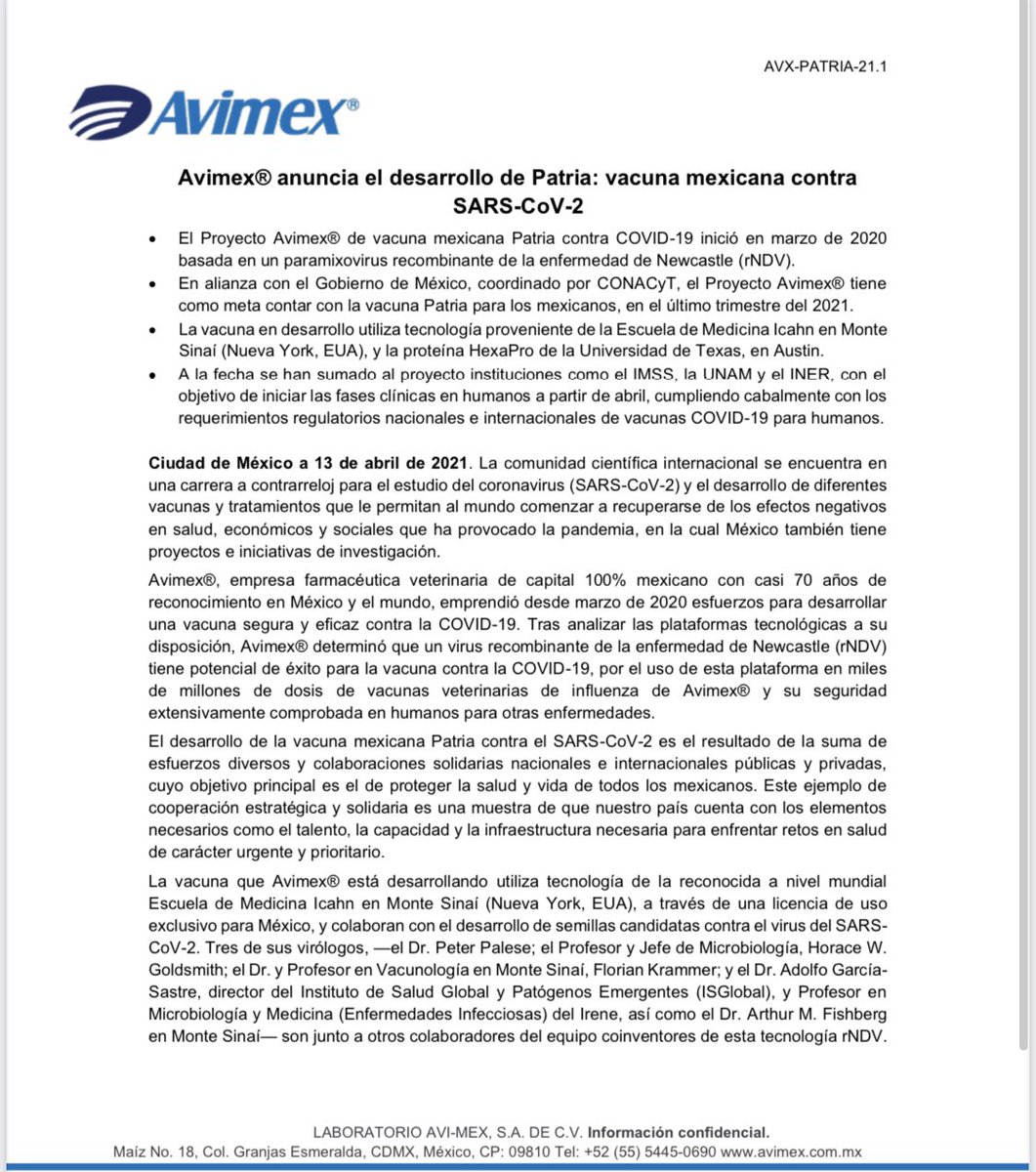 La #VacunaPatria anunciada hoy por el Gobierno Mexicano es la desarrollada por el equipo de @AvimexLab conocida como 💉AVX/COVID-12 de vector viral: usando Paramixovirus de la infección aviar de Newcastle q la empresa produce para vacunas veterinarias desde 2007
