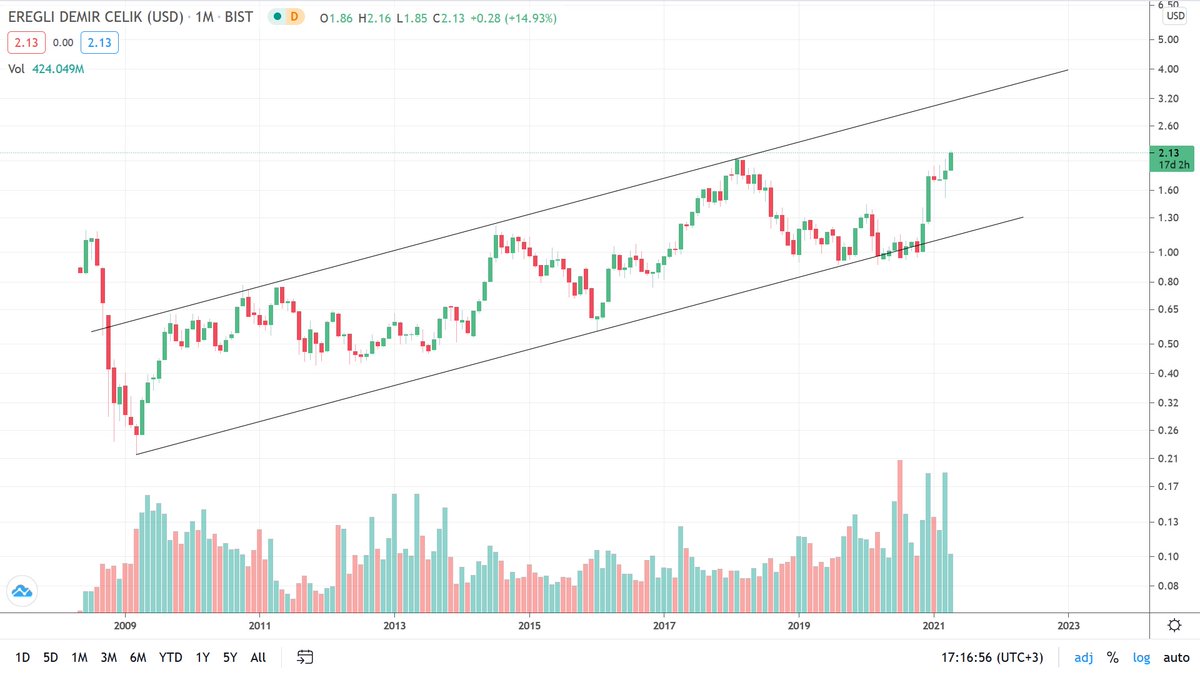 7) Ereğli özelinde konuşursak düzeltilmiş fiyatlarla tarihi zirvesi olan 2.02 doları kırıp geçti. Trend hedefi olan 3.2 dolara kadar gitme ihtimali mevcut.