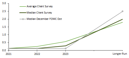 2/5 This notwithstanding, 77% or respondents see the Fed raising rates before the end of 2013. I read this, coupled with the modest forecast for inflation, as a sign that investors do not fully believe that the Fed is committed to its new average inflation targeting framework.