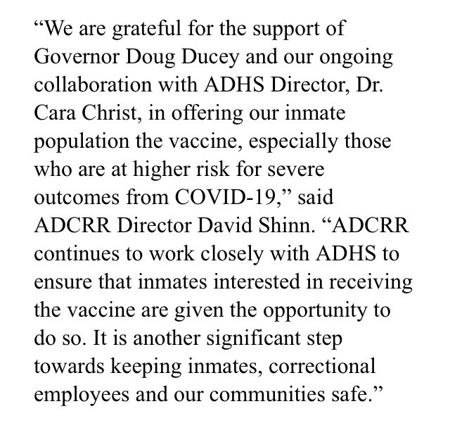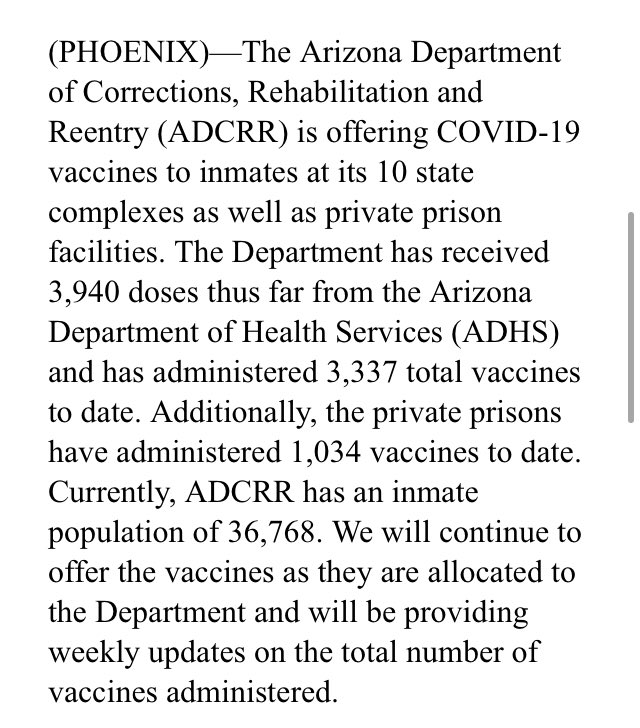 3,337 total vaccines have been administered so far in state prisons. "Additionally, the private prisons have administered 1,034 vaccines to date. Currently, ADCRR has an inmate population of 36,768" - no details on which vaccine but sources tell me it's Moderna