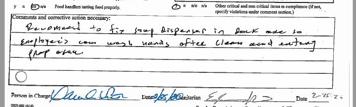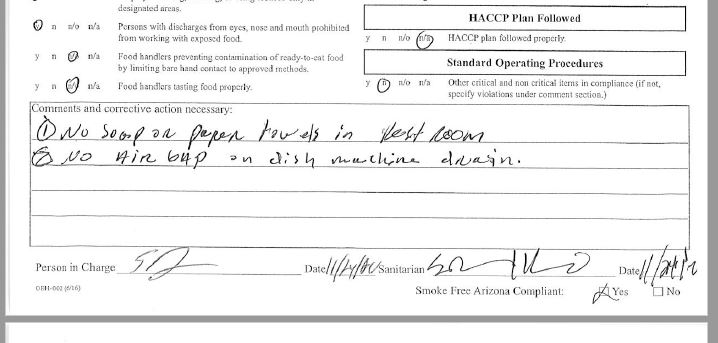 Some very sage food service advice from the Arizona Department of Health Services: "Recommend to fix soap dispenser . . . so employees can wash hands."