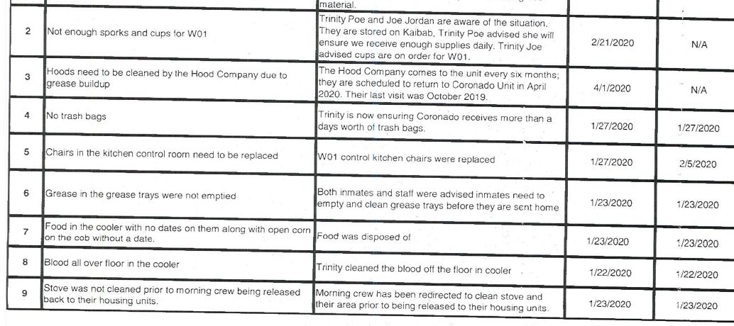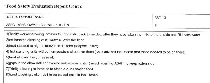 Overall these inspection reports have been a resounding condemnation by DOC of the way Trinity manages the state prison kitchens: "Food all over floor" "Trinity allowing inmates to stand around tasting food"
