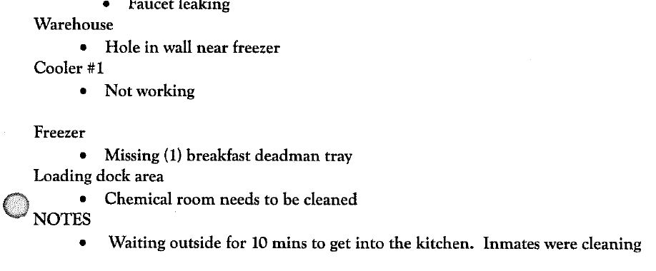"Waiting outside for 10 mins to get into the kitchen. Inmates were cleaning."