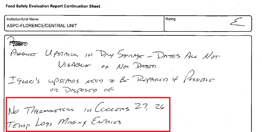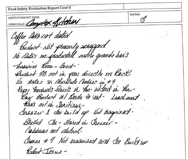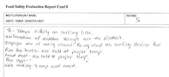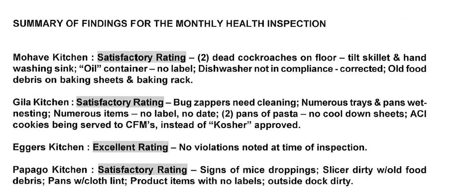 Going through Arizona Department of Corrections food inspections - Kitchens with dead cockroaches and mice droppings get a "Satisfactory" rating - these would be critical violations in any commercial food service facility