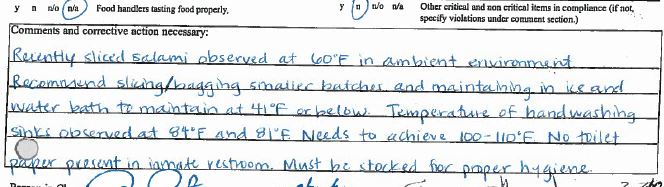 "It was noted by 2 DOC staff present at inspection that inappropriate taste testing of food had been performed by an employee using fingers instead of utensils."