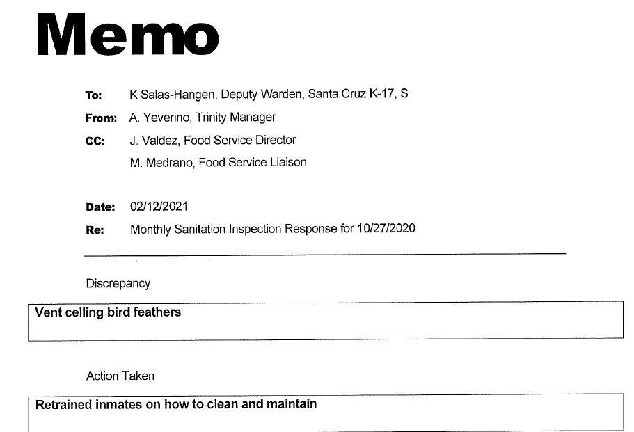 Kitchen staff at Perryville had to be RETRAINED on how to remove bird feathers from the ceiling vents - because the first training didn't take apparently