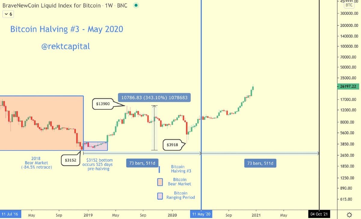 2018 ayı sezonu 2019 başına kadar sürdü ve bitcoin en dip noktada 3152 doları gördü. Sonrasında hafif gene akümülasyon süreci devam etti ve 11 Mayıs geldiğinde 8800 dolar seviyesine ulaşmıştı. Toplamda 511 günlük bir hazırlık diyebiliriz.
