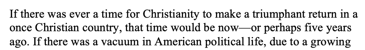 The intellectual and spiritual vacuum intensified due to an unlikely confluence of events in the 2000s, and Trump was able to benefit from this. But there's a counterfactual history where instead of Trump filling the vacuum, Christianity could have made a return. It didn't. 3/x