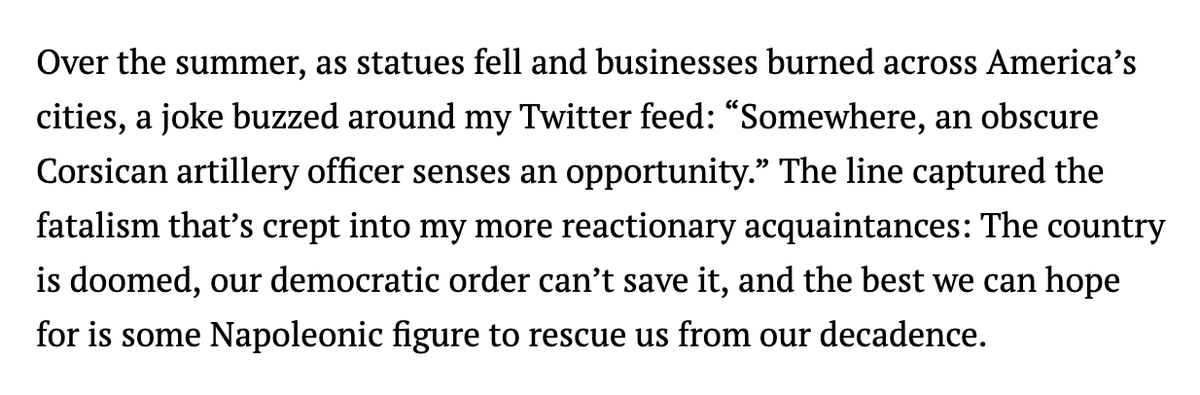 One of the main insights from @douthatnyt's book is that decadence is obviously "bad," but it's by no means the worst thing a society can experience. If the choice is between living with decadence or being "rescued" from it by a Napoleonic figure, I know which I'd choose