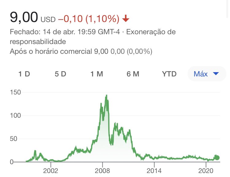 Neste mesmo ano, as ações que chegaram a custar US$230,00, passaram a custar US$9,00.