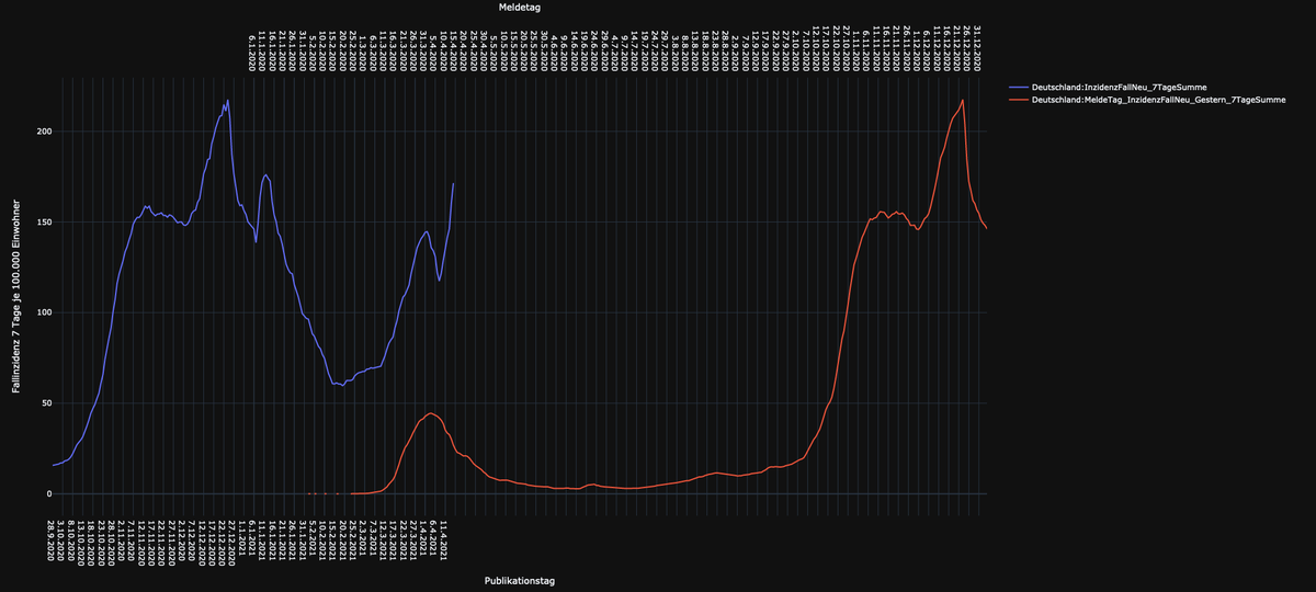 Offizielle RKI 7-Tage-Inzidenz nach Meldedatum, 120,6/100.000 (rot), und die 7-Tage Inzidenz nach Publikationsdatum, 128,9 (blau) klaffen derzeit wegen Ostern stärker auseinander als sonst.