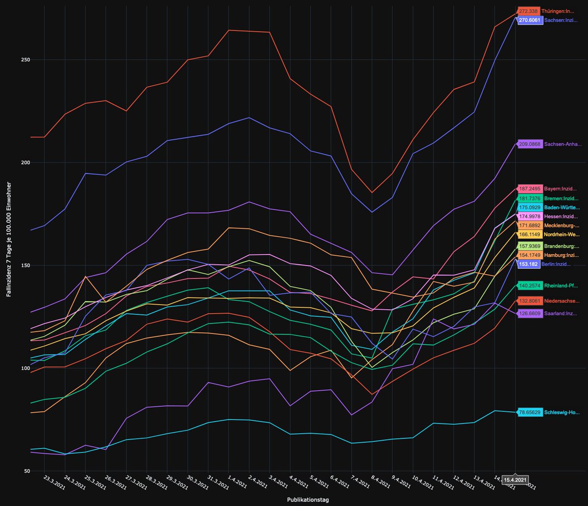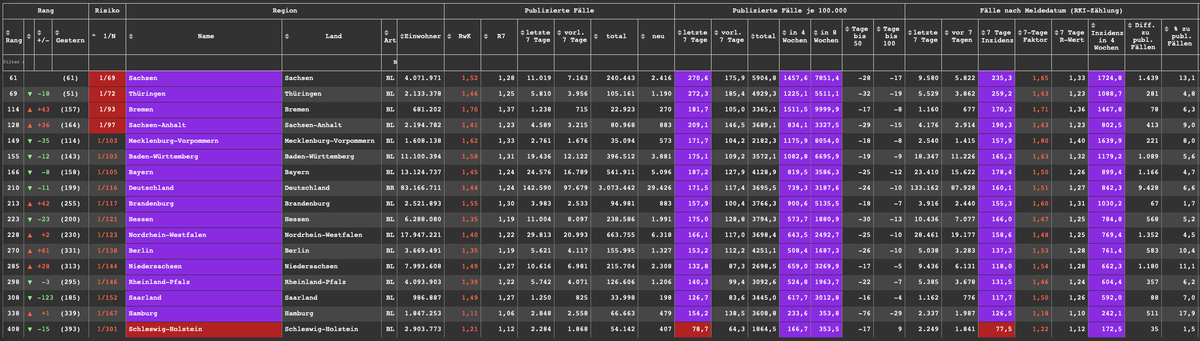 Die Bundesländer auf risikotabelle.de. Sieht alles nicht so toll aus. Könnte heute aber noch etwas Osterunruhe in den 7-Tages-Werten sein, die in den nächsten Tagen aber endlich raus sein müsste.