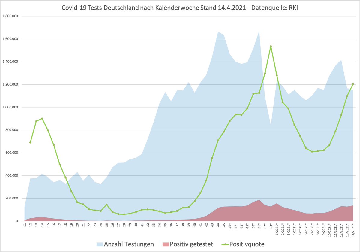 Testzahlen praktisch gleichgeglieben (blau), Positivenquote steigt auf 12,1%.