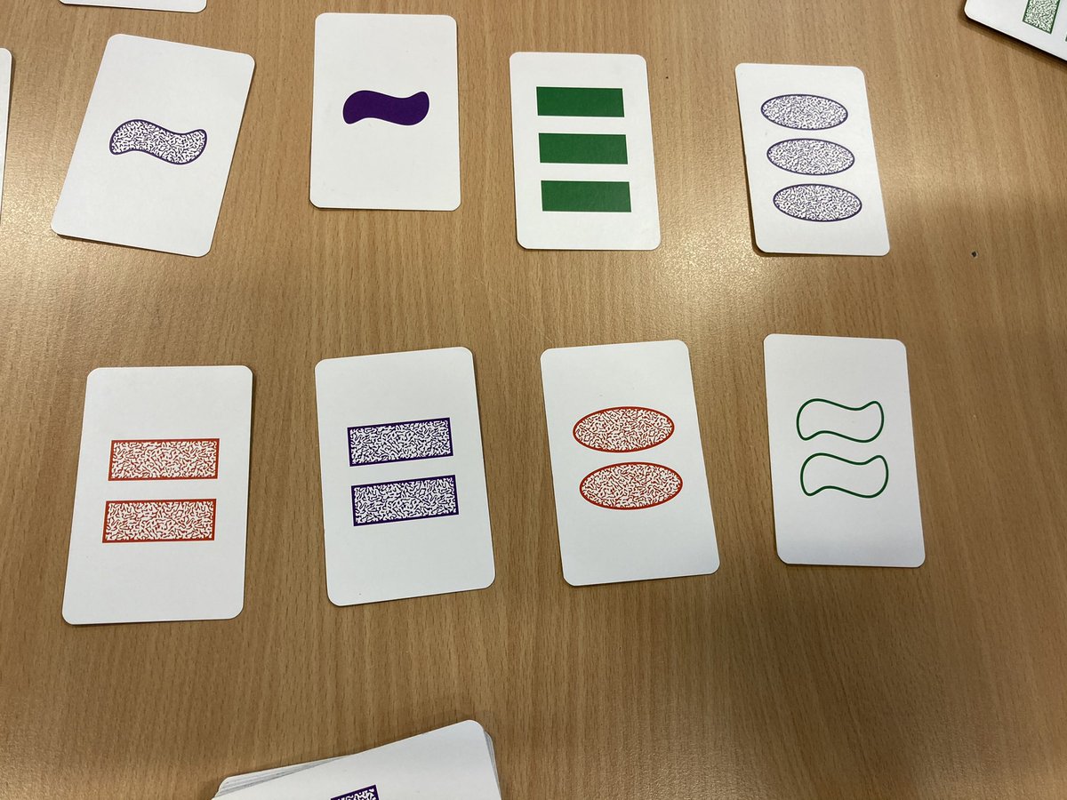 De rekenles afgesloten met een spelletje Set!, op een aangepaste manier. De opdracht was: zoek een set van 1-2-3 met dezelfde vorm. Daarna nog een rondje 1-2-3 met dezelfde kleur. Dus op twee eigenschappen zoeken in plaats van op vier.