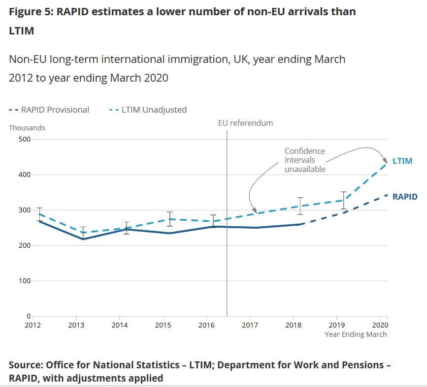 The main report gives revised figures for 9 years to March 2020 using admin data instead of surveys. Total net migration averages 15% higher (43,000/year) in the new data – so not a massive difference given that confidence intervals were around +/- 30-40k anyway