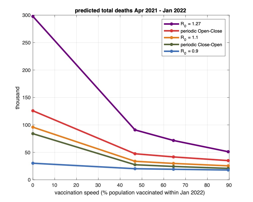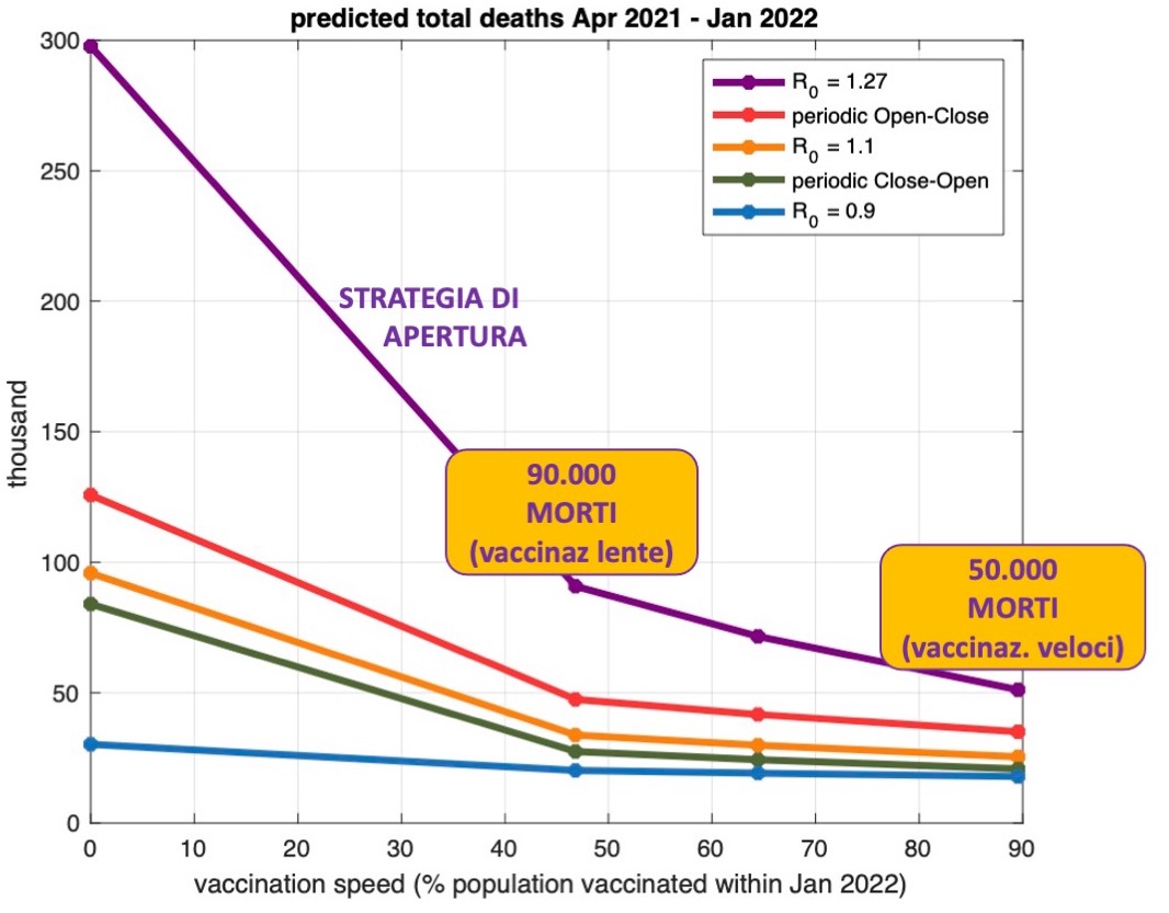 Cosa costa aprire tutto? Allentando il contenimento (R0 = 1.27) con vaccinazioni veloci sono prevedibili altri 50.000 morti che salgono a 90.000 morti con vaccinazioni lente. 6/n
