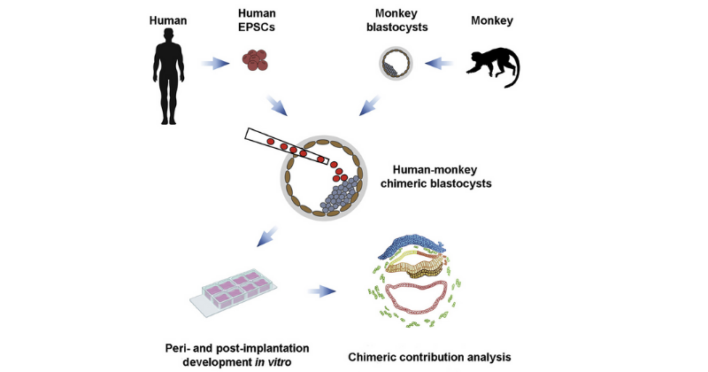 Os pesquisadores na China e nos Estados Unidos injetaram 25 células-tronco humanas em blastocisto (um dos estágios do embrião, aos 6 dias) de primatas da espécie 'Macaca fascicularis' e foram capazes de cultivar os embriões quiméricos (de duas espécies) por um até 20 dias.