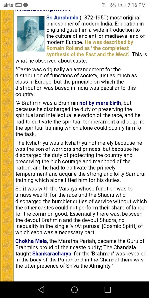 11. Aurobindo take on varna is more with soul classification. A person can be born into a family because of his past karma with family.
