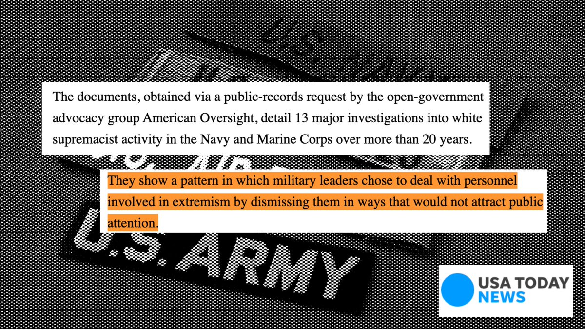 Records we obtained and @USAToday reported on detail 13 major investigations into white supremacist activity in the Marine Corps and Navy and show military leaders have quietly discharged the people involved in the incidents. americanoversight.org/the-u-s-milita…