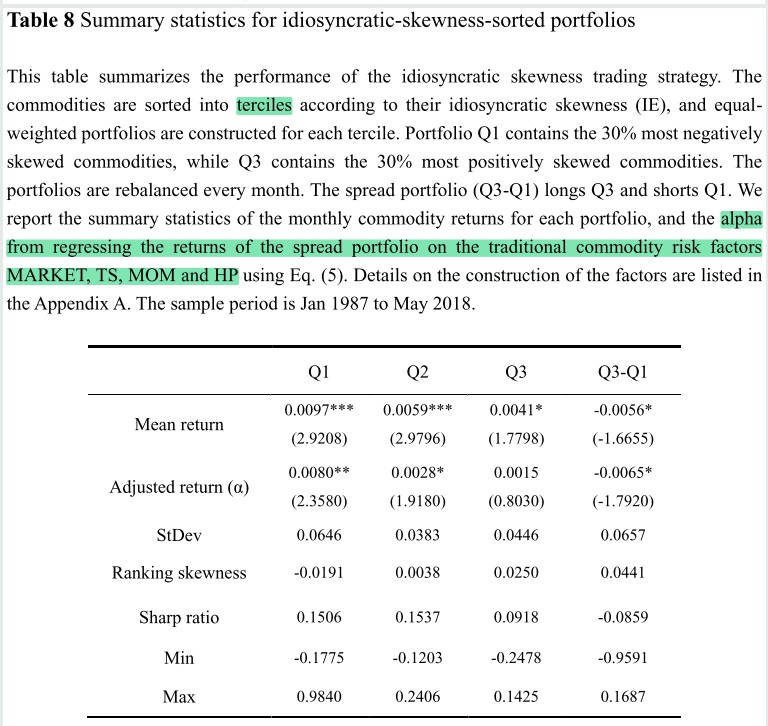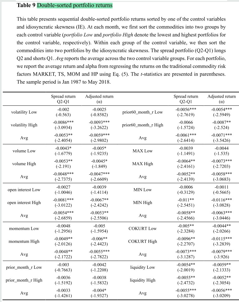 3/ "An increase in the idiosyncratic skewness will reduce the expected returns of commodities even after controlling for other characteristics. This implies that idiosyncratic skewness, as measured by IE,
