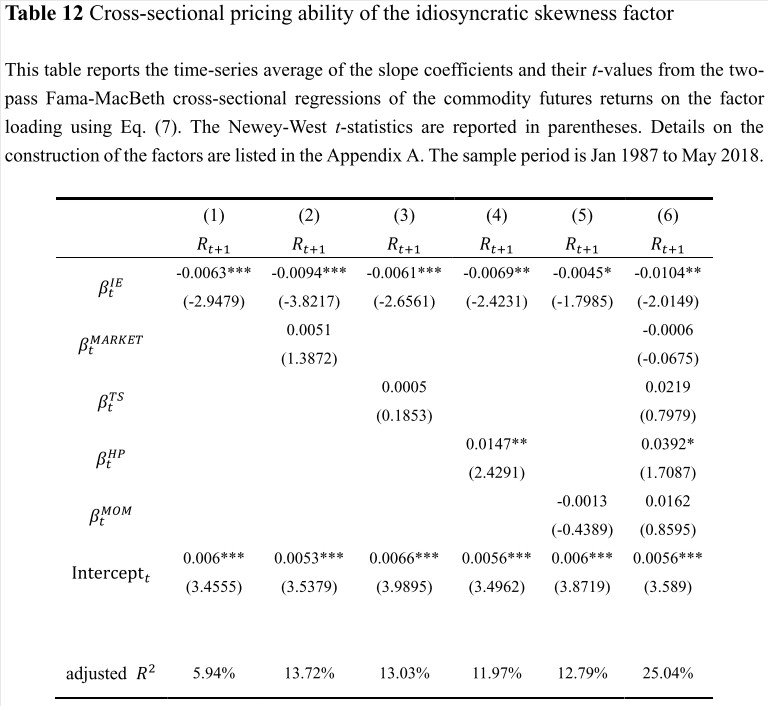 12/ "Investors require compensation for exposure to commodity futures with more negative levels of idiosyncratic skewness. After controlling for traditional risk factors separately or jointly, the price of IE is still negative and significant."