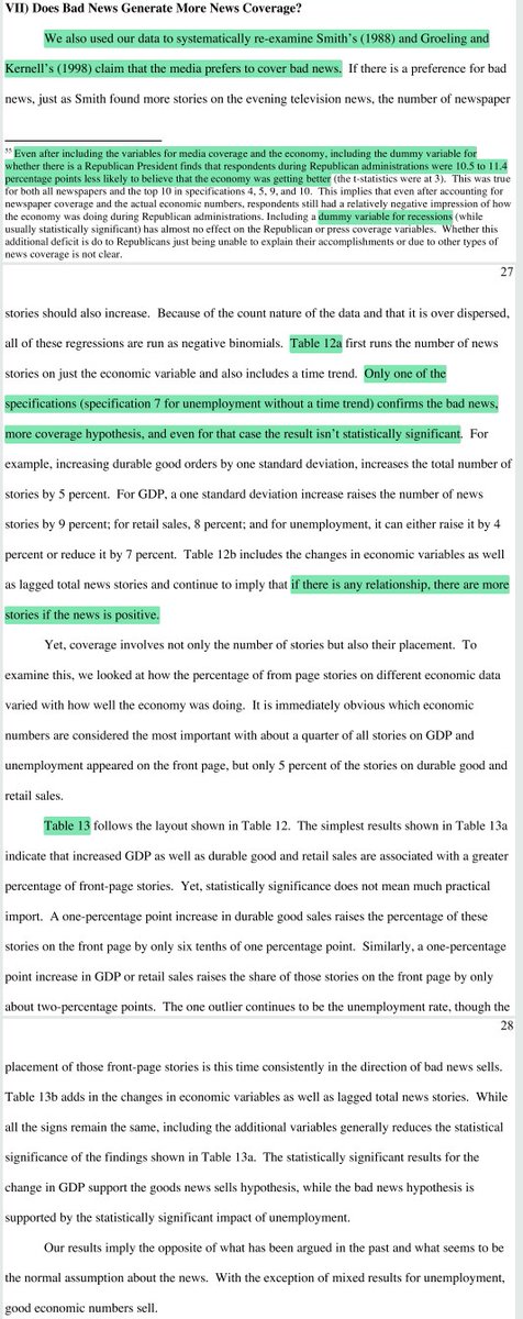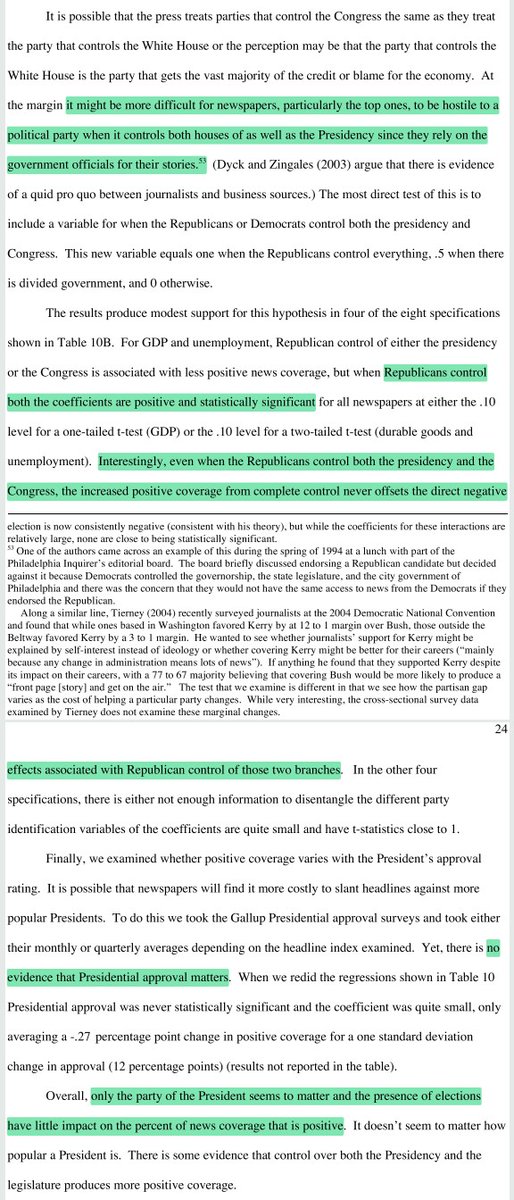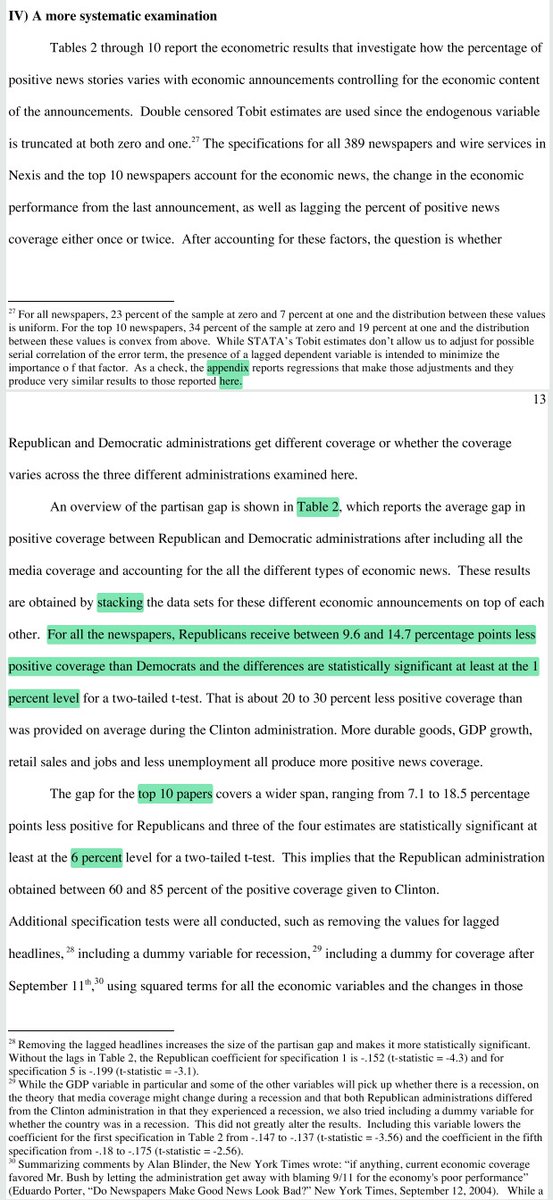 5/ "For all newspapers together, Republicans receive 9.6-14.7 percentage points less positive coverage than Democrats (differences stat. significant at 1%) after controlling for economic content of announcements."