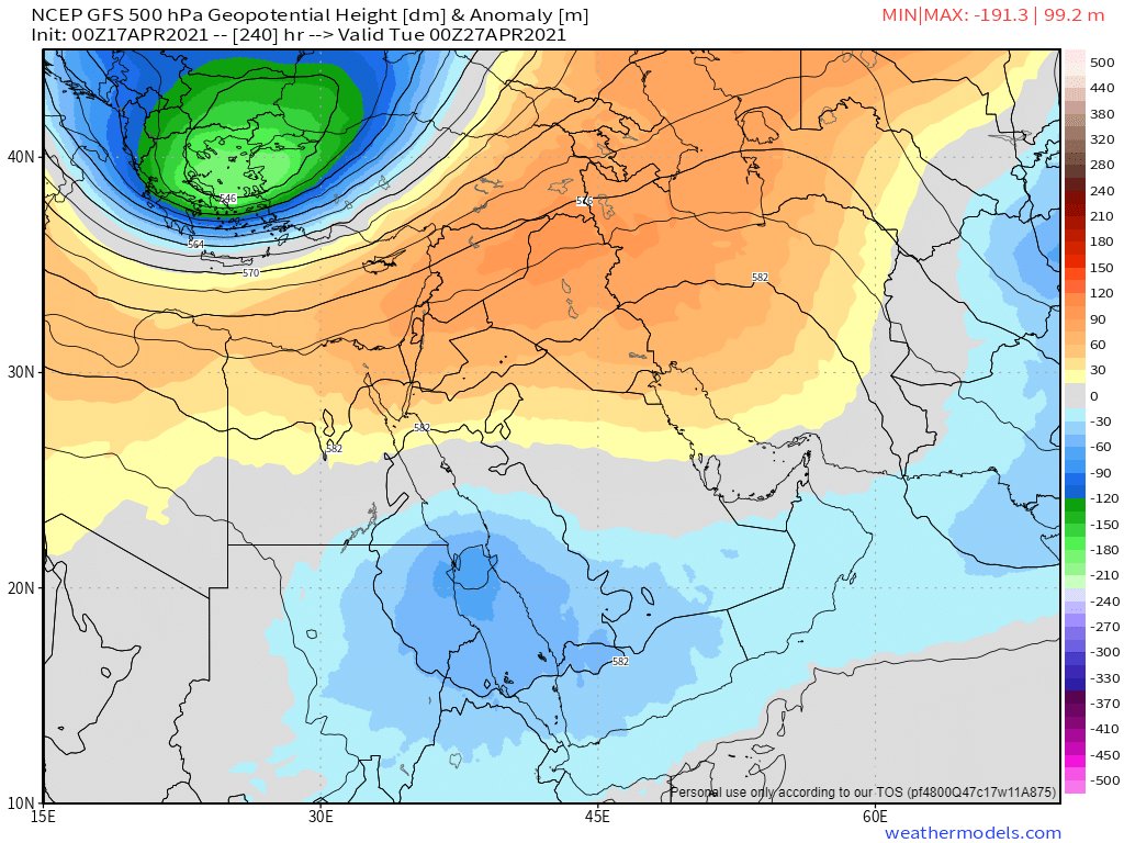 The greenblob [GFS - right image, top left corner previous tweet] is a low pressure proxy. It is the result of an new infusion of wet air which has transited the Sahara into the Middle East which ECMWF has not seen. And it is about to become a rain band across Iraq and Syria.