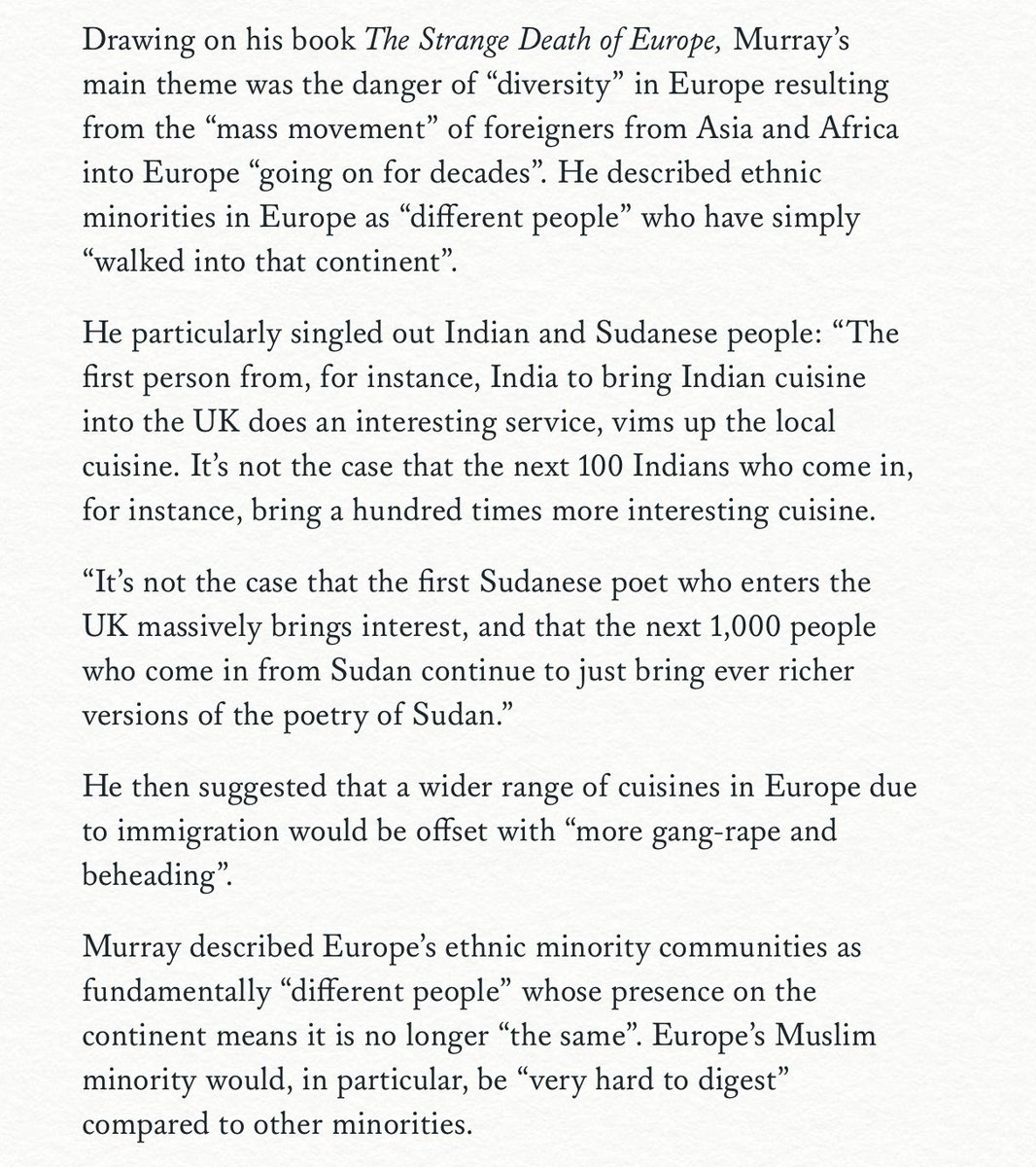Douglas Murray spoke at the Restoration Weekend of the Horowitz foundation, which Nafeez Ahmed describes as a “Who’s Who of Trumpworld white nationalists” where he made some questionable comments about “gang rape and beheadings” and European immigration bylinetimes.com/2020/11/02/mic…
