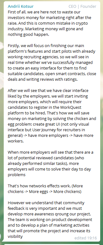 $WQT has a large public team and they are very active in telegram, often hosting AMAs & answering questions. I've been impressed with their knowledge on the freelance & blockchain space