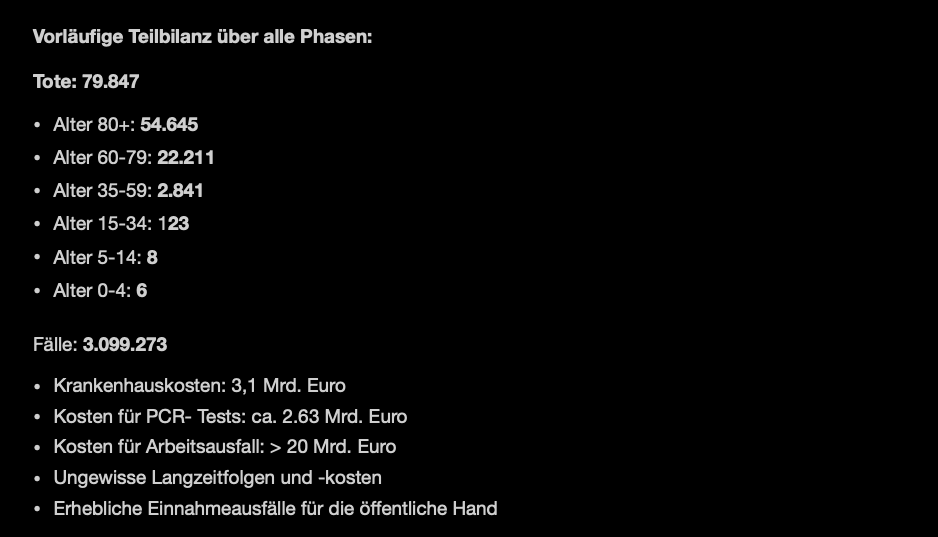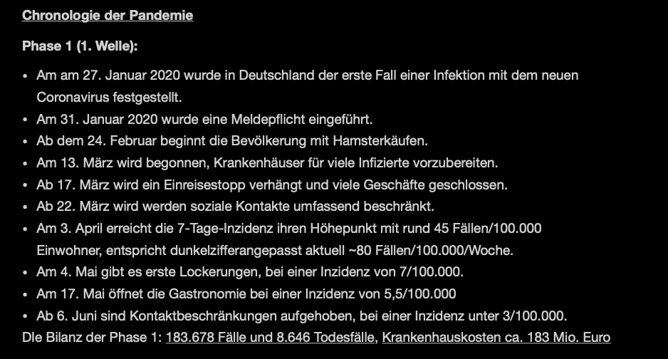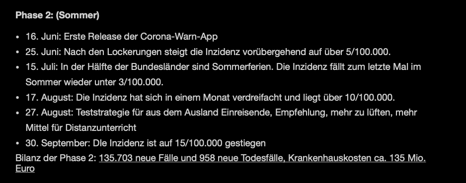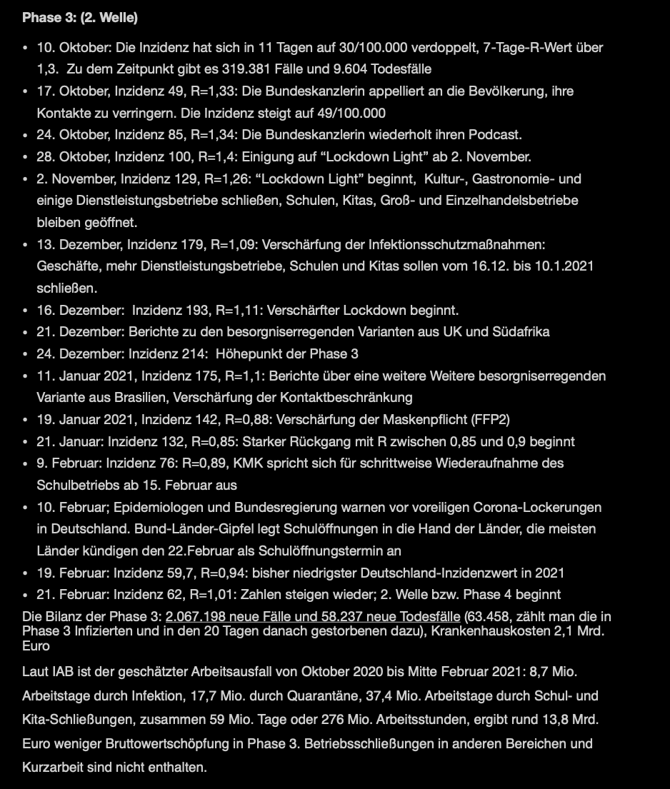 Aus Sicht der Politik mag das hier tendenziös erscheinen, weil die Kranken und Toten und nicht die Überlebenden und die Verdienste aufgezählt werden oder was gut lief, aber die Politik hat viel getan, und Einiges davon ist aufgezählt in den schwarzen Textboxen. Wie zeitig, ...