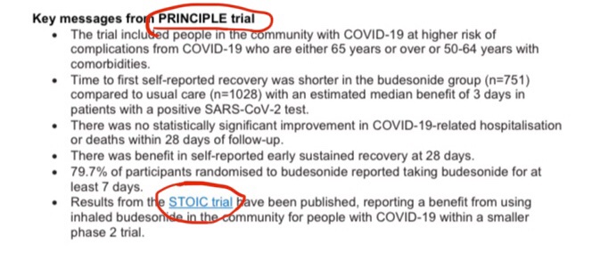 ix. Com o STOIC e o PRINCIPLE não cabe mais dúvida sobre a *existência* de benefícios clínicos substanciais de budesonida inalada precoce -- daí o endosso do NHS. Uma vez completado, o PRINCIPLE dará estimativas mais precisas dos *tamanhos* destes efeitos.