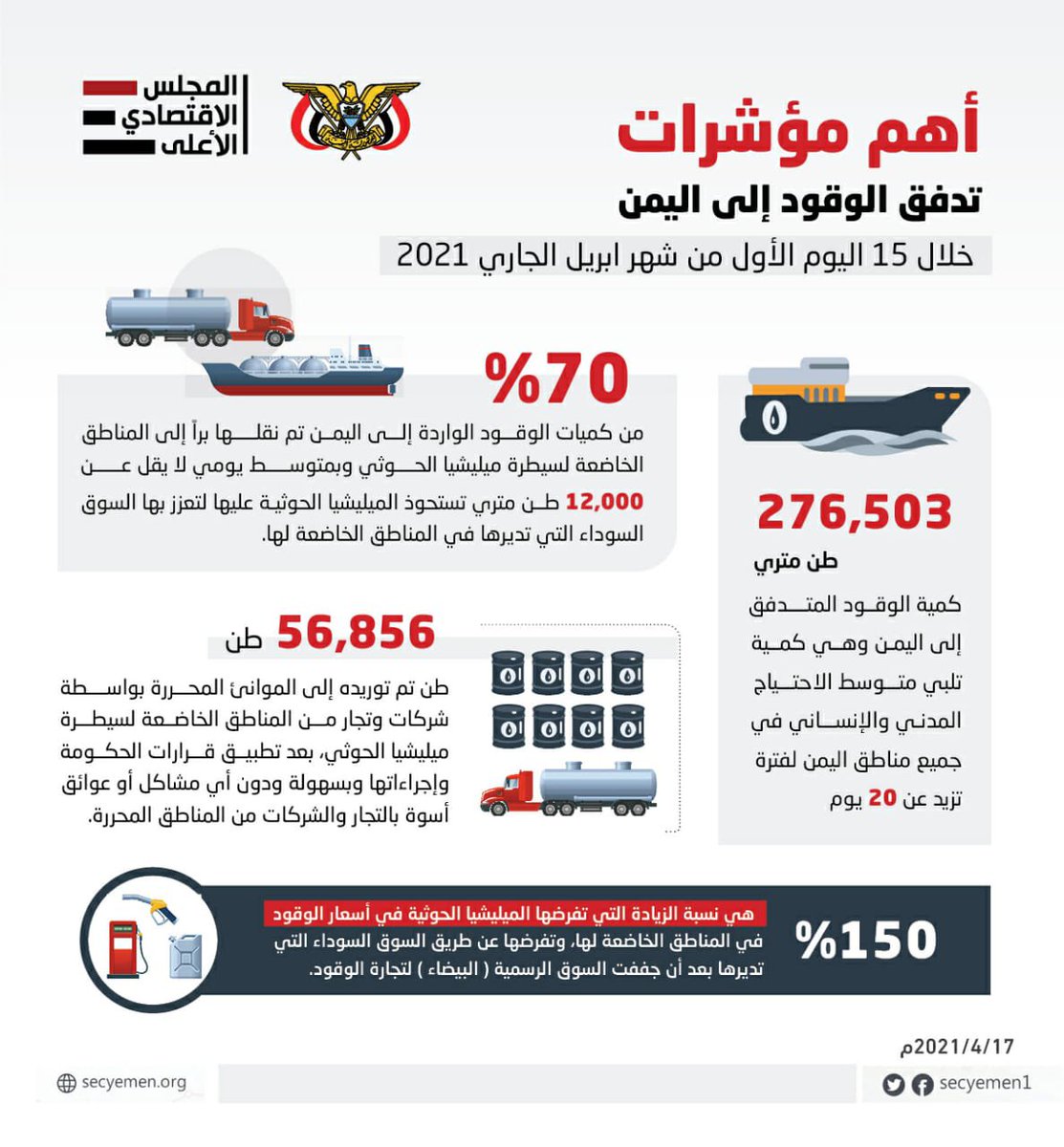 1-Indicators of fuel flow to Yemen during 1st half of April 2021, published by Supreme Economic Council, confirming uncover the blockade lie, &Houthi militia’s fabrication of oil crisis in areas it controls to revive black market it runs, &plunder citizens to finance war effort.