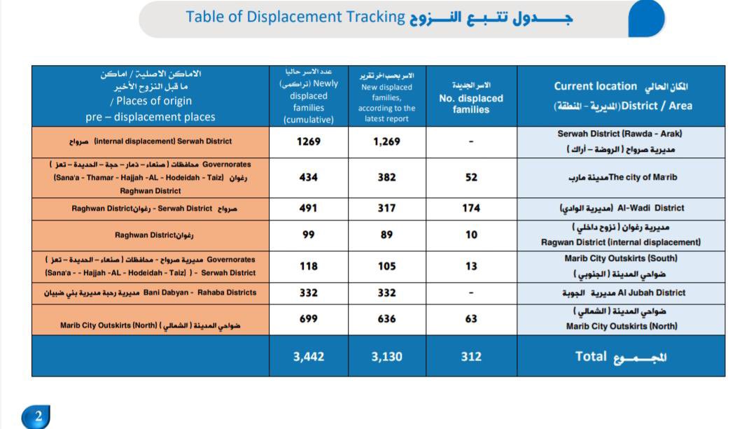 ٢-التقرير يؤكد أن عدد النازحين الجدد في محافظة مأرب من تاريخ 6 فبراير إلى 16 ابريل الجاري بلغ قرابة (3.442) أسرة نازحة يبلغ عدد افرادها (24.094) نازح، انتقلوا من مديريات (صرواح، رغوان، ومدغل، بني ضبيان، الرحبه) إثر تصعيد مليشيا الحوثي الارهابية، إلى مناطق بعيدة عن خطوط التماس