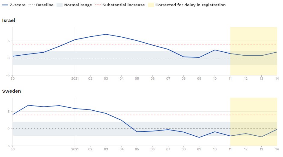 Vaccinerne er betinget godkendt pga. reduktion af symptomatisk infektion. Men reducerer de også dødeligheden? - Her dødeligheden for 65+ i vaccinationsperioden med >90% vaccineret i Israel i uge 9, sml. m. Sverige. #stopdet#dkpol#dkmedier#sundpol#Covid19dk#coronadk#COVID19