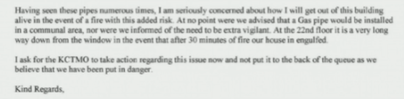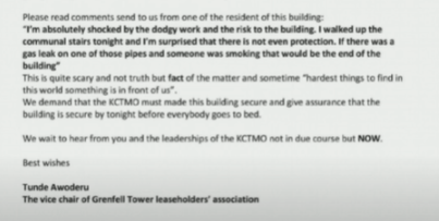 GTLA picked this up in March 2017, calling for an independent inspector to check that the works being carried out were safe. Vice chair Tunde Awoderu's email contained a warning that "if there was a gas leak and someone was smoking... that would be the end of the building"