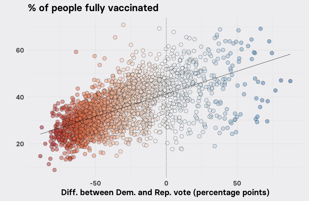 3/ Willingness to get vaccinated had become part of America's partisan divide. This chart shows votes in the 2020 presidential election plotted against vaccine rollout by county. buzzfeednews.com/article/petera…