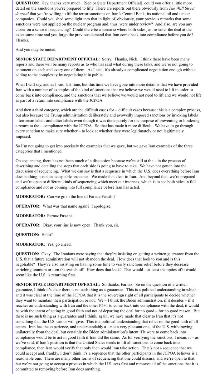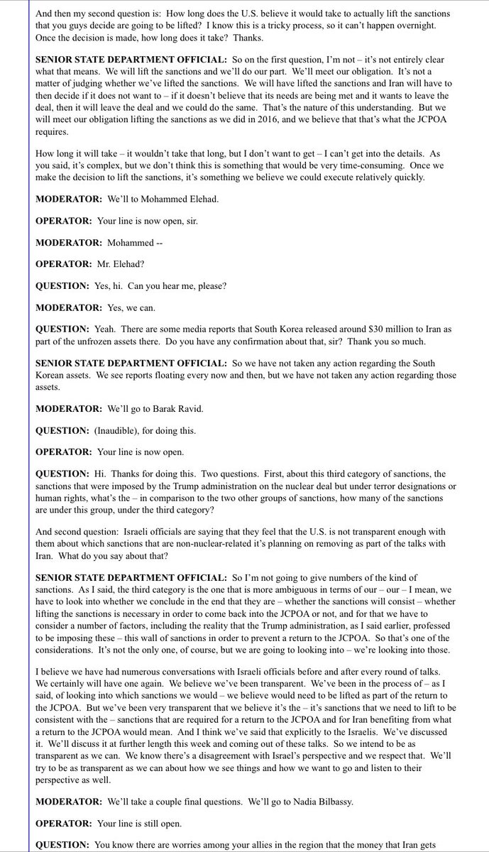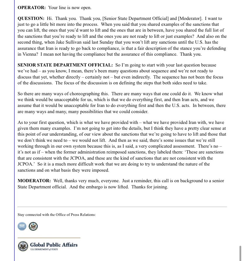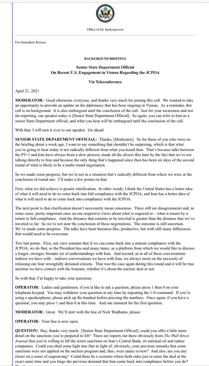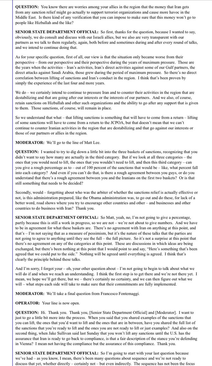 این متن کامل گفتگوی تلفنی دیشب یک مقام ارشد آمریکایی در مورد گفتگوها در وین است. این بار دوم است که این مقام ارشد خبرنگاران را در جریان پیشرفت و موانع موجود در مسیر بازگشت به برجام قرار میدهد. در این چند تویت محورهای اصلی حرفهاش را مینویسم. ۱- سرفصلها و تصویری از تحریمهایی که
