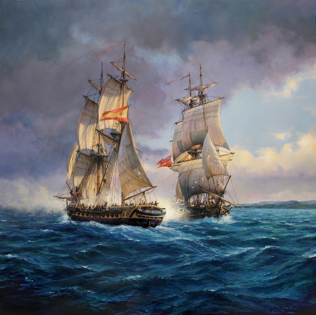 Les propongo un juego tanto a los profanos como a los marinos curtidos: de este maravilloso cuadro del maestro @DalmauFerrer ¿Qué tipos de barco aparecen? ¿Quién tiene el barlovento? ¿Quién dirían que va ganando o ganará? Les leo y próximamente hilos sobre ello. #Cosasnavales