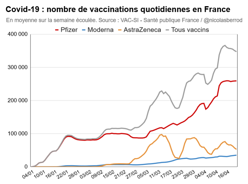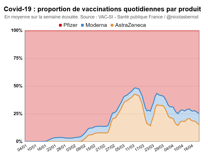 Seules 15% des vaccinations réalisées chaque jour (en moyenne glissante) sont de l'#AstraZeneca. Ce taux était de 43% mi-mars et de 33% fin mars. ⤵️ #Covid19 1/6