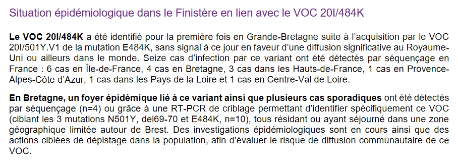 On parle beaucoup moins du 4ème variant "préoccupant" 20I/484K (le variant UK avec en plus la mutation E484K). 16 cas ont été recensés par séquençage en France et "un foyer épidémique ainsi que plusieurs cas sporadiques" ont été détectés en Bretagne. 1/4 santepubliquefrance.fr/maladies-et-tr…