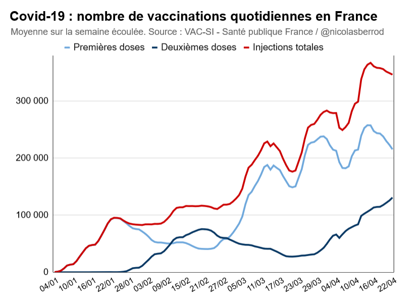 Un peu plus de 346 000 vaccinations sont réalisées chaque jour (en semaine glissante), en légère baisse pour le 7ème jour consécutif, donc. L'écart se rétrécit encore un peu plus entre le nombre de premières doses et celui de deuxièmes doses quotidiennes (en moyenne). 2/4