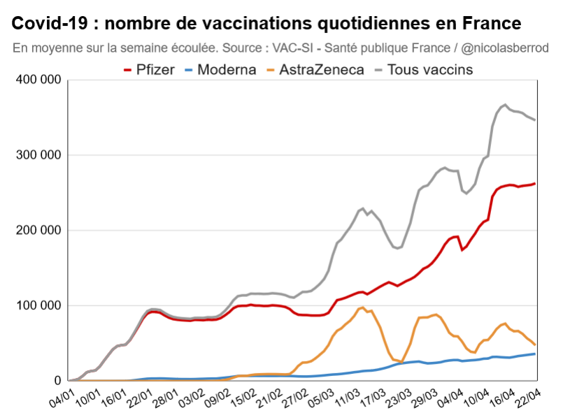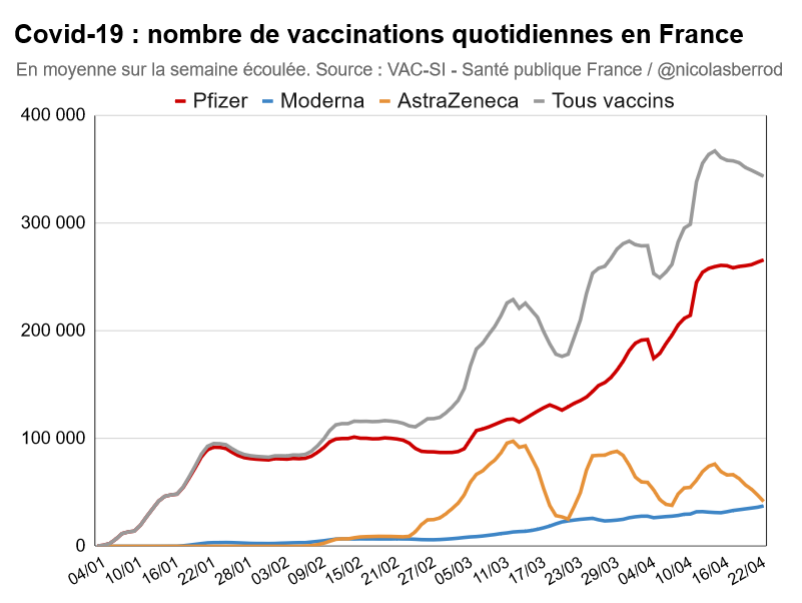 Le creux pour AZ autour du 20 mars s'explique par la suspension de ce vaccin pendant trois jours. ⤵️ #Covid19 1/5