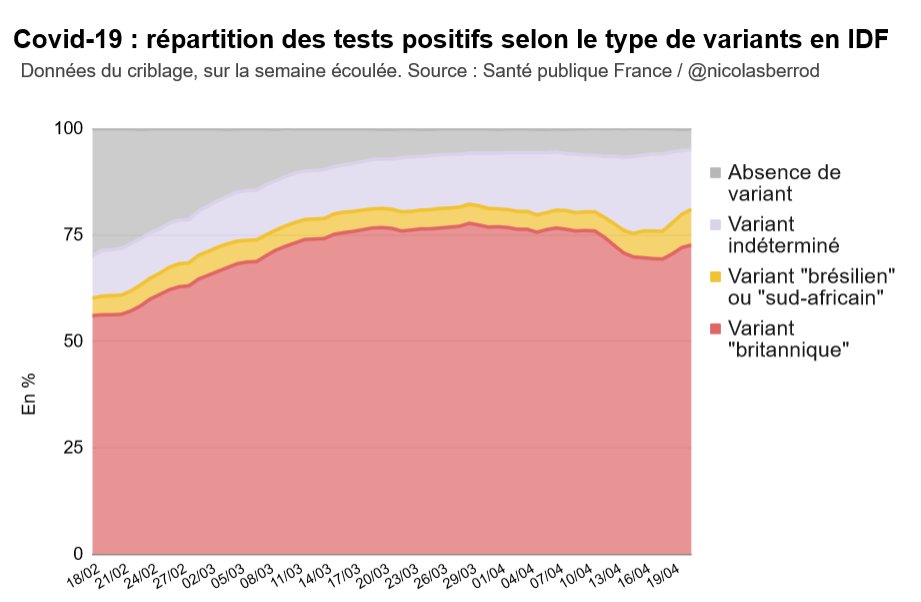 La part de variants dits "sud-africain" ou "brésilien" parmi les tests positifs criblés reste sous les 5% en France, mais elle est passée de 4,4 à 8,4% en dix jours en Île-de-France. ⤵️ #Covid19 1/4