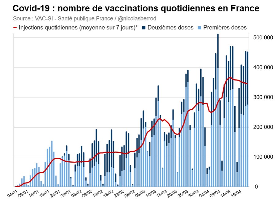 Le record de vaccinations en 24h ne sera pas battu cette semaine. 453 861 doses ont été administrées hier (chiffre provisoire), 8e jour consécutif que ce nombre est (un peu) inférieur à celui du même jour de la semaine précédente. ⤵️ #Covid19 1/4