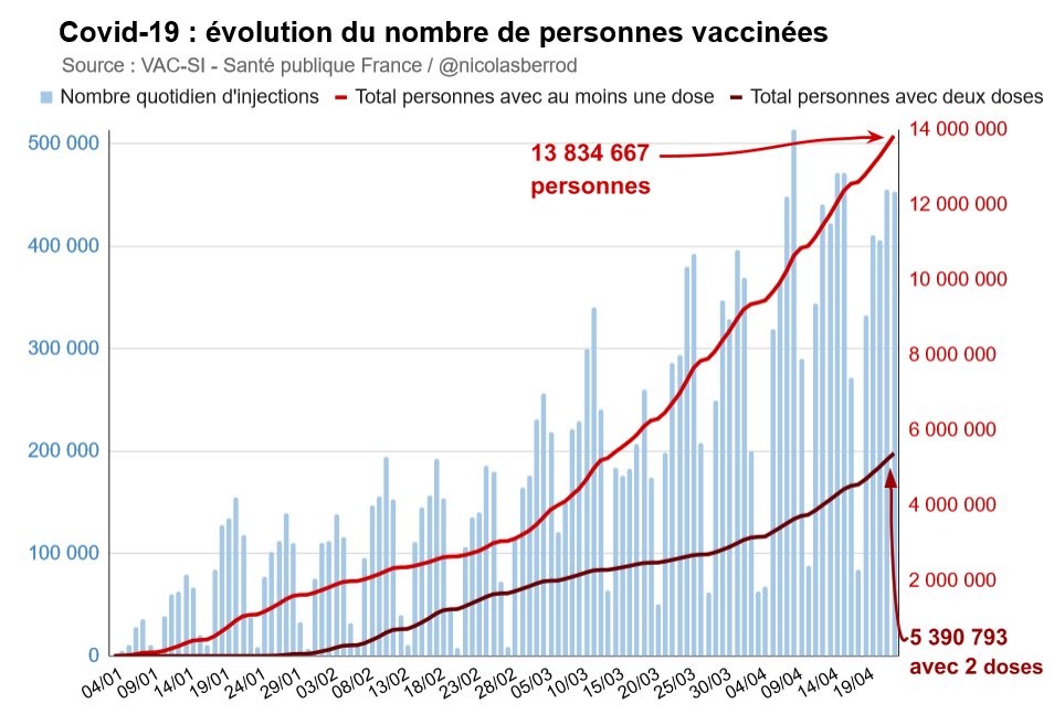 Au 23 avril, près de 14 millions de personnes ont reçu une première dose de vaccin. Près de 5,4 millions d'entre elles en ont reçu deux. #Covid19 3/4