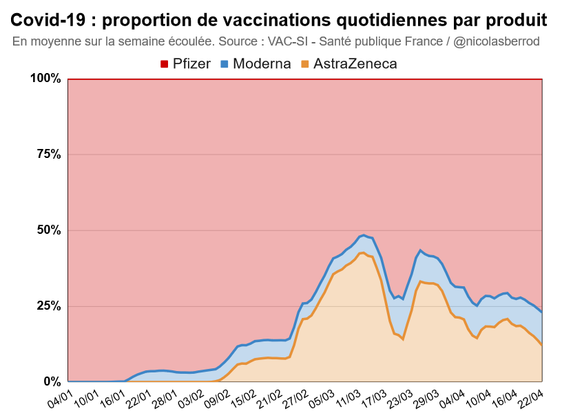 #AstraZeneca ne représente plus que 12% des vaccinations quotidiennes (en moyenne glissante). Ce taux était de 43% mi-mars. 2/5