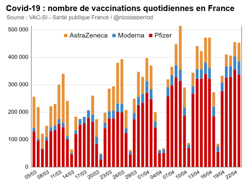 Hier, vendredi 23 avril, plus de 450 000 vaccinations ont été réalisées (chiffre provisoire), dont :